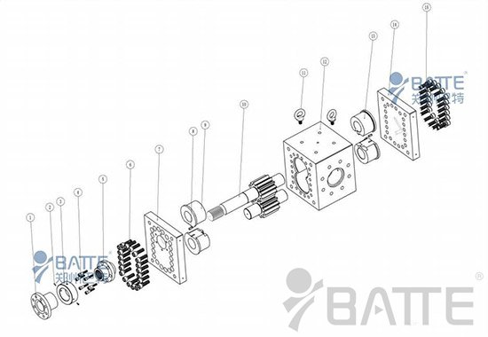 熔體泵結(jié)構(gòu)主要由泵體、主動齒輪和從動齒輪、滑動軸承、前后端板、填料密封等部件組成,被廣泛應(yīng)用于塑料、樹脂、橡膠、化纖制品的擠出成型。